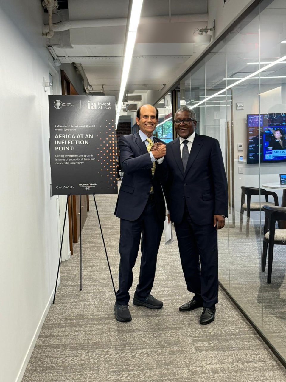 Left to right: Chairman and Founder of the Milken Institute, USA, Michael Milken; Founder and President/Chief Executive of the Dangote Group, Aliko Dangote at an Invest Africa event – ‘Africa at an inflection point’, organised by the Milken institute, at the Rockefeller centre , New York.