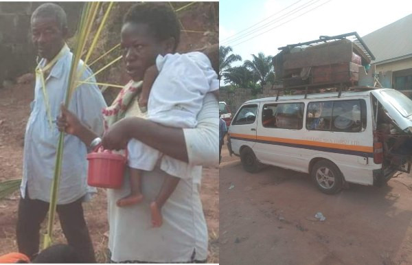 A picture shared by Chinonso showed members of the community handing the man and his daughter fresh palm fronds, while some more palm fronds were tied round the man’s neck and his daughter’s legs as signs that they were engaged in abominable acts.