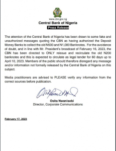 “To avoid confusion, and in accordance with Mr. President’s broadcast of February 16, 2023, the CBN has been directed to ONLY reissue and recirculate the old N200 banknotes, which are expected to circulate as legal tender for 60 days until April 10, 2023.