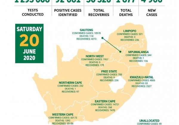APO NewsCOVID-19 Statistics in South Africa by LEVI JOHNSONJune 21, 20200785 Share1 Test conducted – 1293608 Positive cases Identified – 92681 Total recoveries – 50326 Total Deaths – 1877 New Cases – 4966 Share this: Click to share on WhatsApp (Opens in new window) WhatsApp Click to share on X (Opens in new window) X Click to share on Facebook (Opens in new window) Facebook Click to share on LinkedIn (Opens in new window) LinkedIn Click to print (Opens in new window) Print Click to share on Telegram (Opens in new window) Telegram