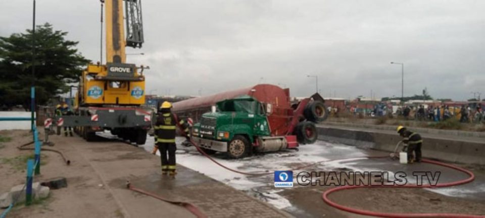 Spokesperson of LASEMA, Nosa Okunbor said the tanker with registration number KSF 260 XY which was loaded to capacity with 55,000 litres of PMS (Petrol) ran into a pothole and fell sideways due to reckless driving.