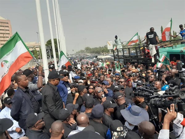 Big wiggs of the Peoples Democratic Power, PDP have stormed Abuja streets to protest in what they described as a fraudulent judgement of the Supreme Court which sacked Emeka Ihedioha and installed Hope Uzodinma of the ruling All Progressive Congress.