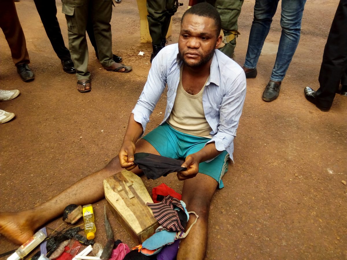 The Enugu State Police Command, Tuesday, paraded a self-acclaimed pastor, Sunday Egbo after a small coffin, multiple female pants and braziers were recovered from his house.