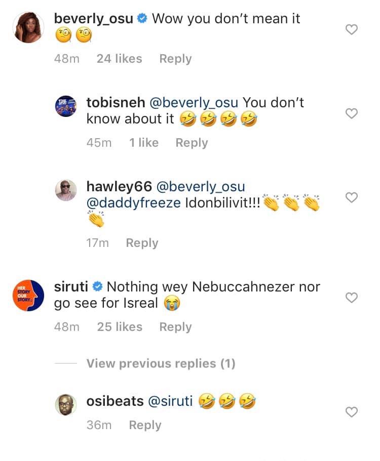 Uti Nwachukwu and Beverly Osu who reacted to the testimony which has sparked off a controversy, dropped sarcastic comments.