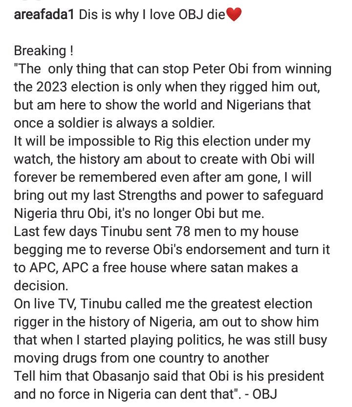 “Last few days Tinubu sent 78 men to my house begging me to reverse Obi’s endorsement and turn it to APC, APC a free house where satan makes a decision. On live TV, Tinubu called me the greatest election rigger in the history of Nigeria, am out to show him that when I started playing politics, he was still busy moving drugs from one country to another. Tell him that Obasanjo said that Obi is his president and no force in Nigeria can dent that”.- OBJ”…