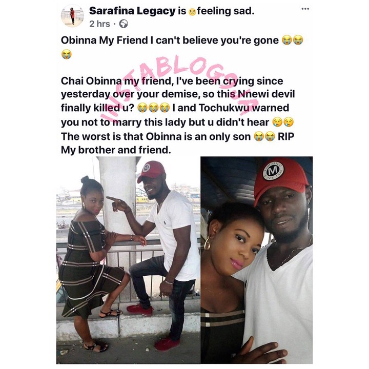 “Obinna my friend I can’t believe you are gone ?? , Chai I’ve been crying since yesterday over your demise, so this Nnewi devil finally killed you? I and Tochukwu warned you not to marry this lady but you didn’t hear. The worst is that Obinna is an only son ?? Rest in peace my brother and friend”