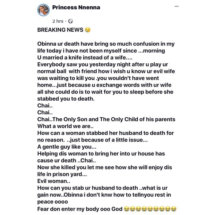 “Obinna your death has brought so much confusion in my life today, I’ve not been myself since morning. You married a knife instead of a wife. Everybody saw you yesterday as you played your normal ball with friends. How I wish you knew your evil wife was waiting to kill you. You wouldn’t have gone home. Just because you exchange words with your wife, all she could do is wait for you to sleep before she stabbed you to death”